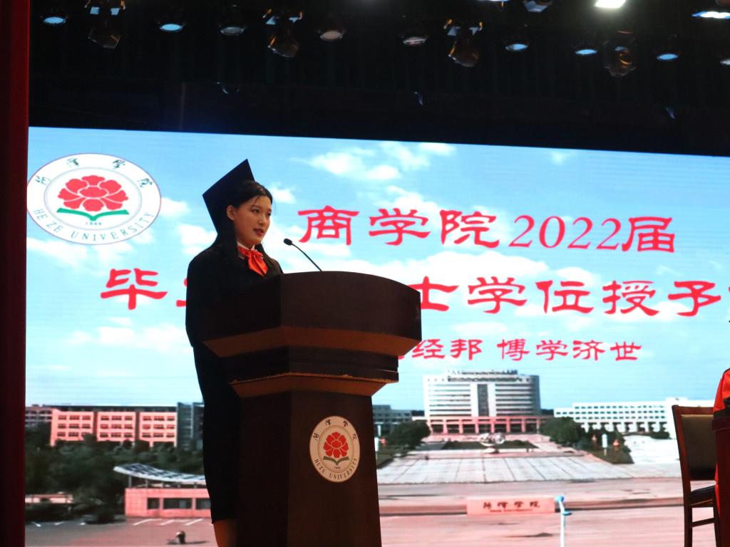 学位授予仪式在全体人员起立、奏响国歌中拉开序幕。随后,洪梅香宣读《太阳成集团tyc9728关于授予董世龙等373名本科毕业生学士学位的决定》。接着各位领导走到台前依次为毕业生颁发学位证书。毕业生代表赵天悦发言,她饱含深情地回忆了校园生活的难忘时光,感谢母校的栽培、恩师的教诲。教师代表、金融工程专业主任宇宸博士发言,他希望同学们通过自己的努力获得美好的未来,为祖国、为人民、为中华民族的伟大复兴事业贡献自己的力量。最后,田建军讲话,他勉励师生实现人生价值,牢记太阳成集团tyc9728院训——“厚德经邦 博学济世”。
