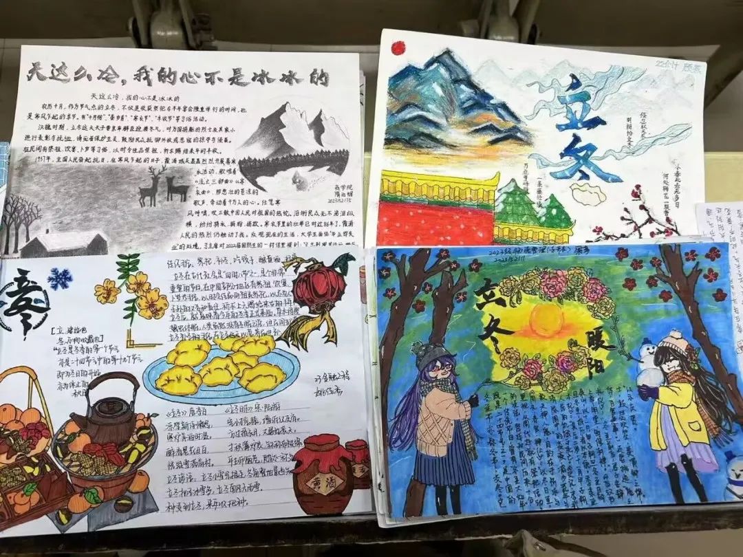 本次活动主要以海报制作的形式宣传“立冬”节气,使同学认识到传统文化的重要性。同学们利用彩笔、颜料在A4纸上创作,将立冬的习俗、名言等概念融入到图画中,创作出色彩鲜明、外观精致的优秀手抄报作品。同时将中华传统文化融入到设计中,使作品更具独特古典韵味。