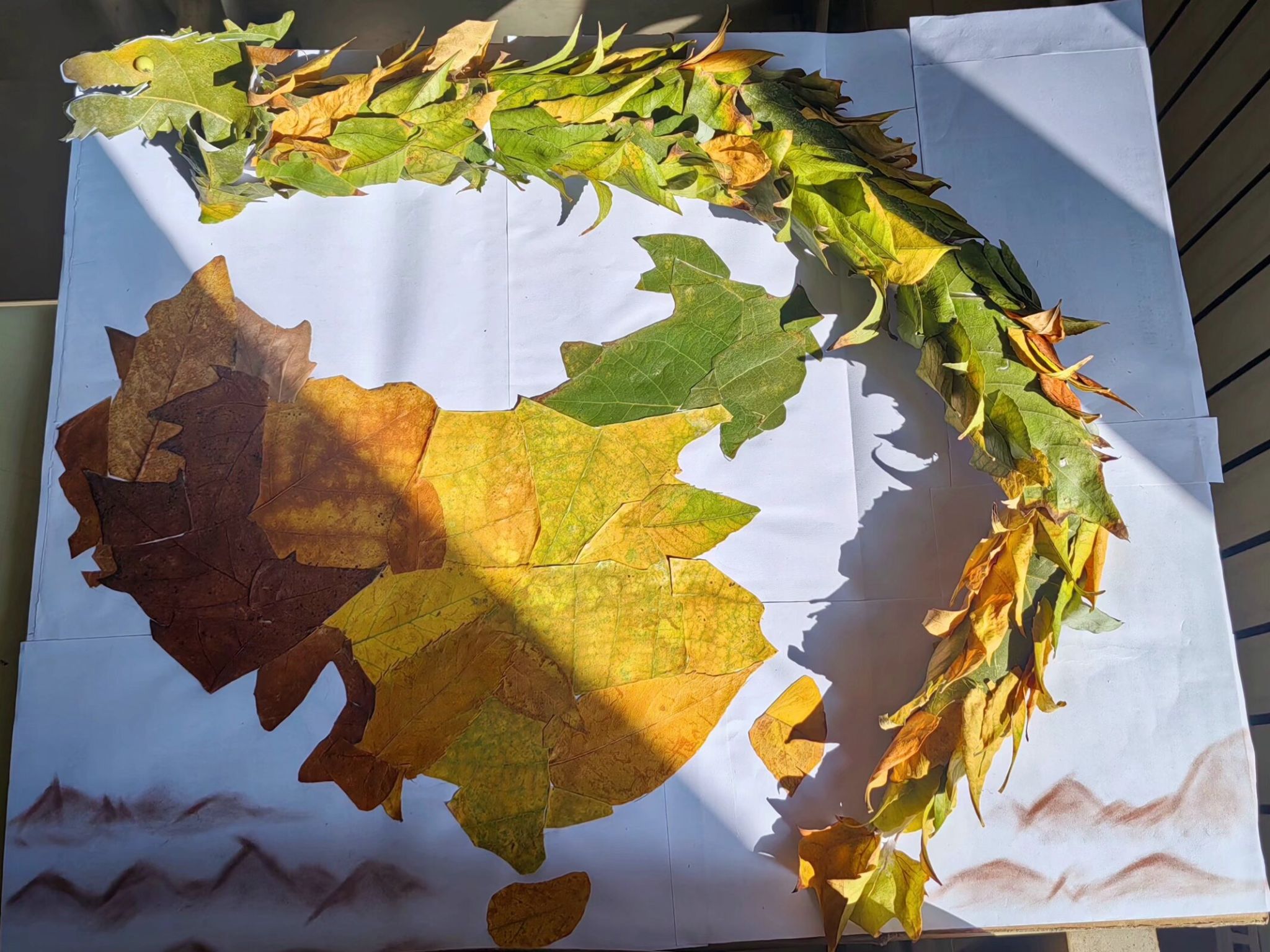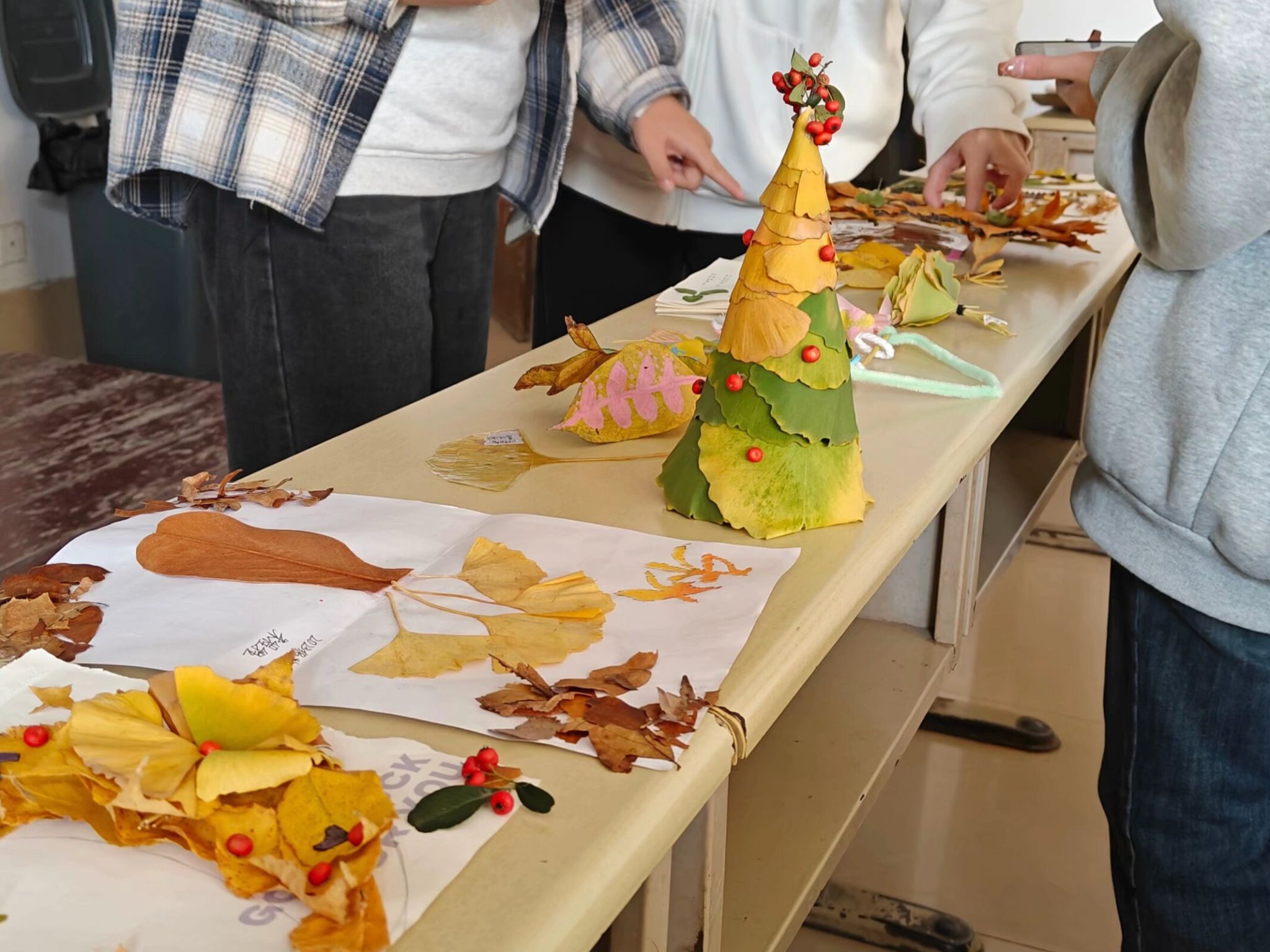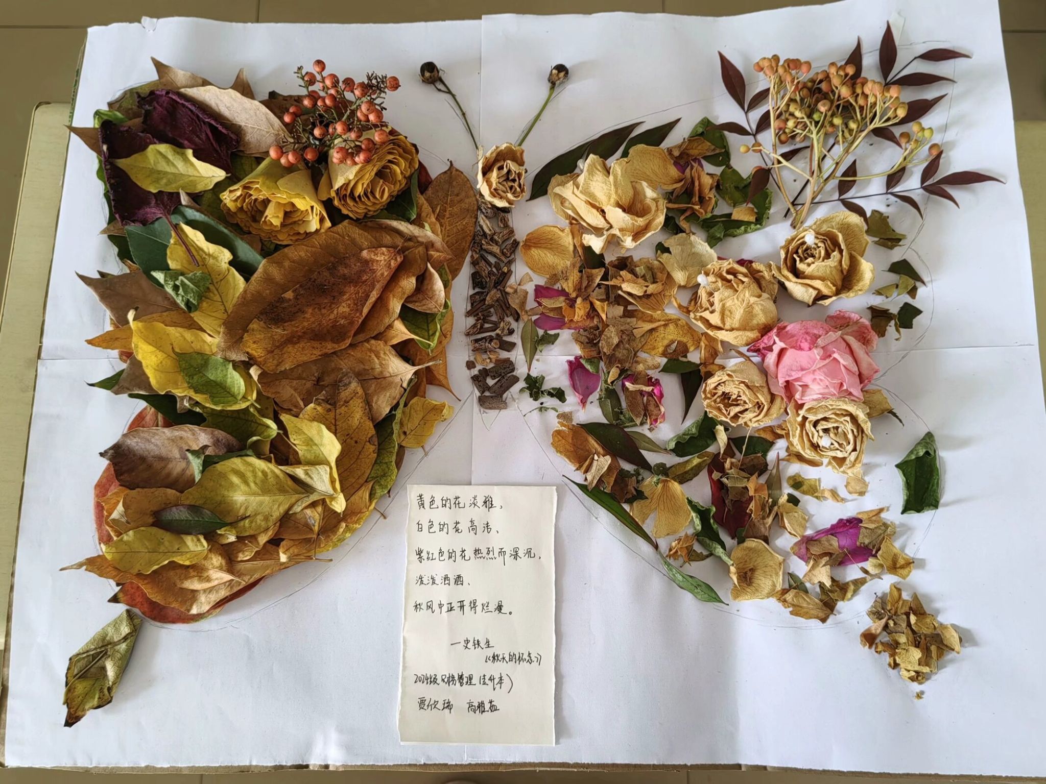 在此次活动中,同学们以落叶为媒介,融入创意元素,巧妙地通过拼贴画、手工花束等形式,充分展示落叶的自然色彩。其中2024级物流管理(专升本)的刘俊宏与孔庆靓同学,巧妙运用拼贴技巧,绘制出我国版图的平面图案,再以手工技艺,让立体“中国龙”栩栩如生,为落叶注入了新的活力与内涵,彰显了其独特的视角与思考。