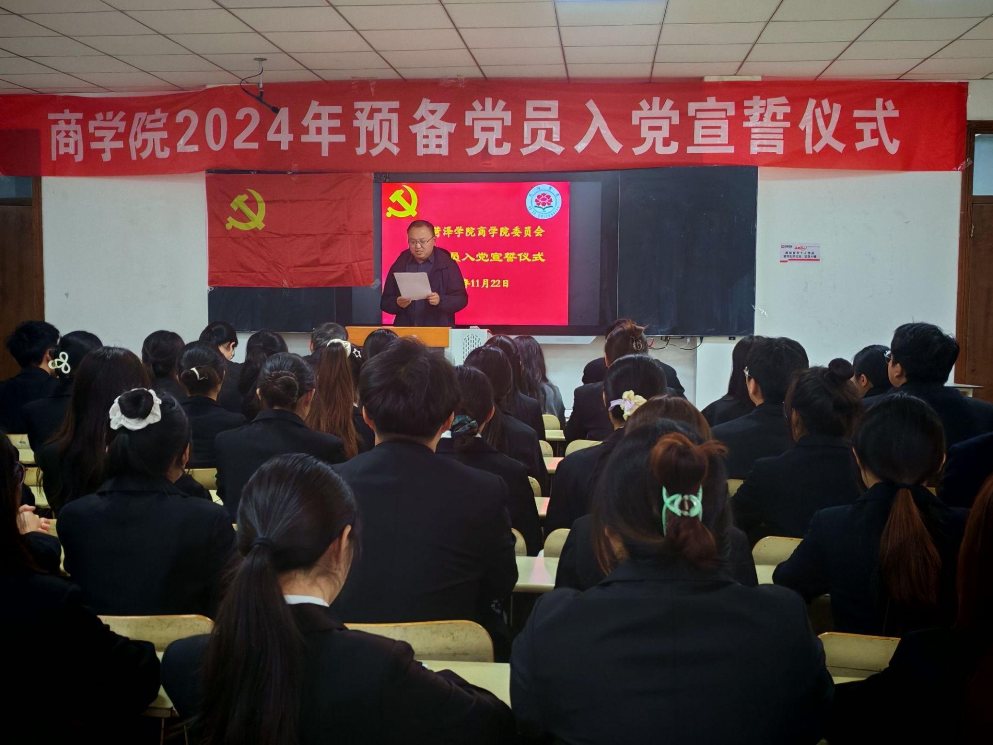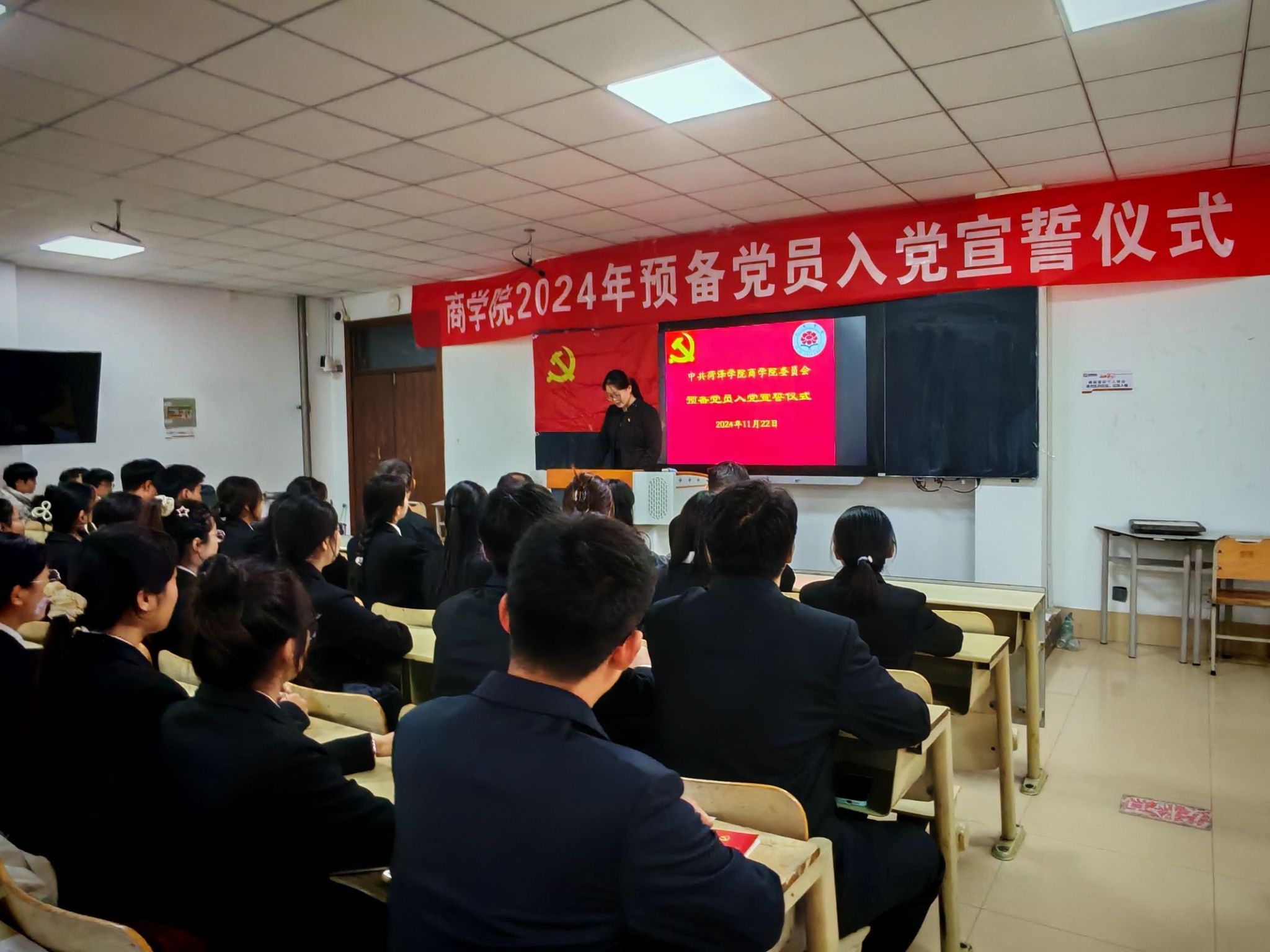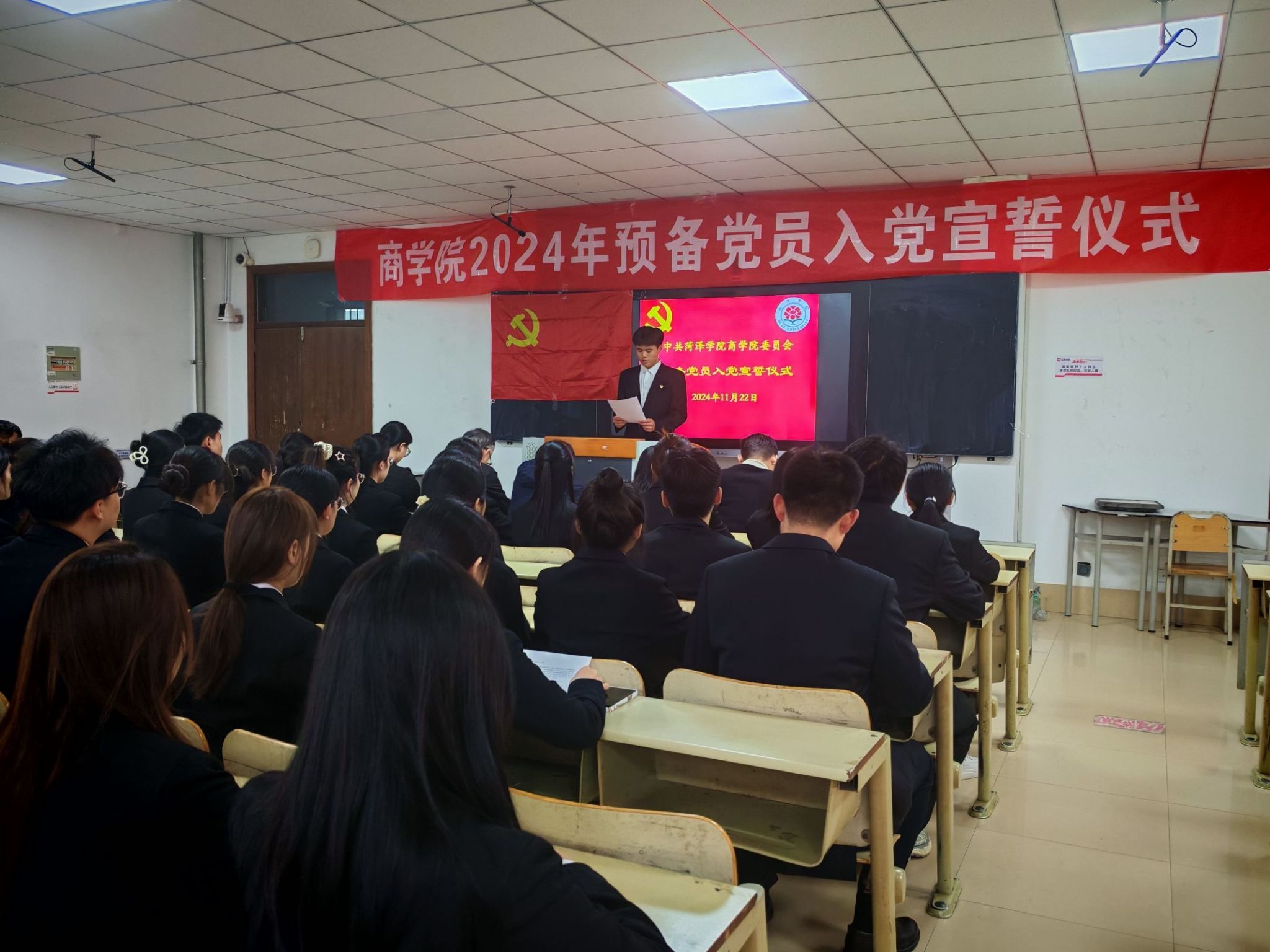 为了强化党员意识,提升党性认识,深化对党的忠诚度,以确保党员队伍的纯洁性与先进性。11月22日,太阳成集团tyc9728在8号教学楼204教室举办了2024年预备党员入党宣誓仪式,公司党委副书记朱贺、员工工作办公室主任孙雪、员工第二党支部书记贺民、教师党员朱树荫、夏修新及新加入党组织的44名预备党员、正式党员代表及入党积极分子代表出席会议,会议由员工工作办公室主任孙雪主持。