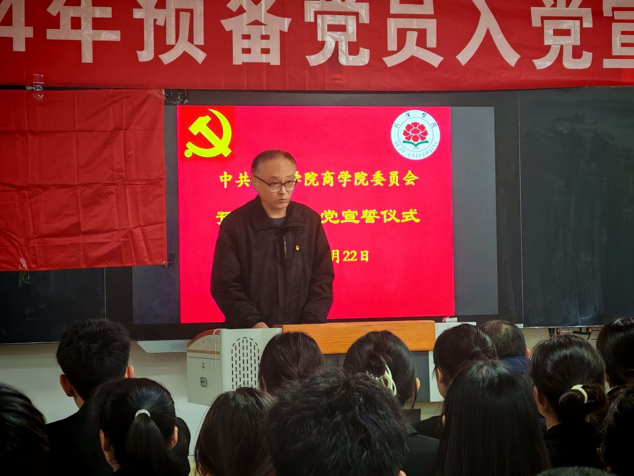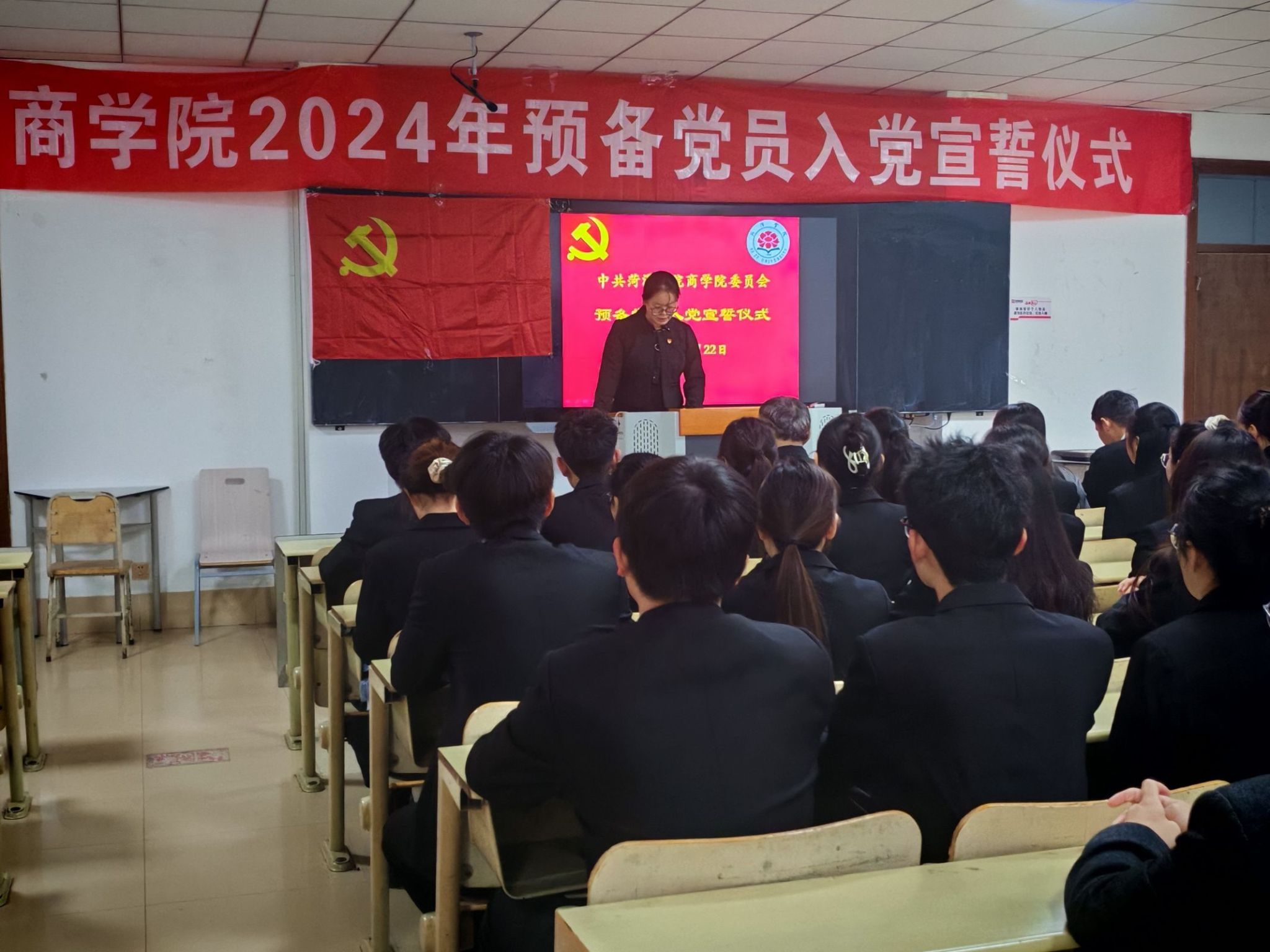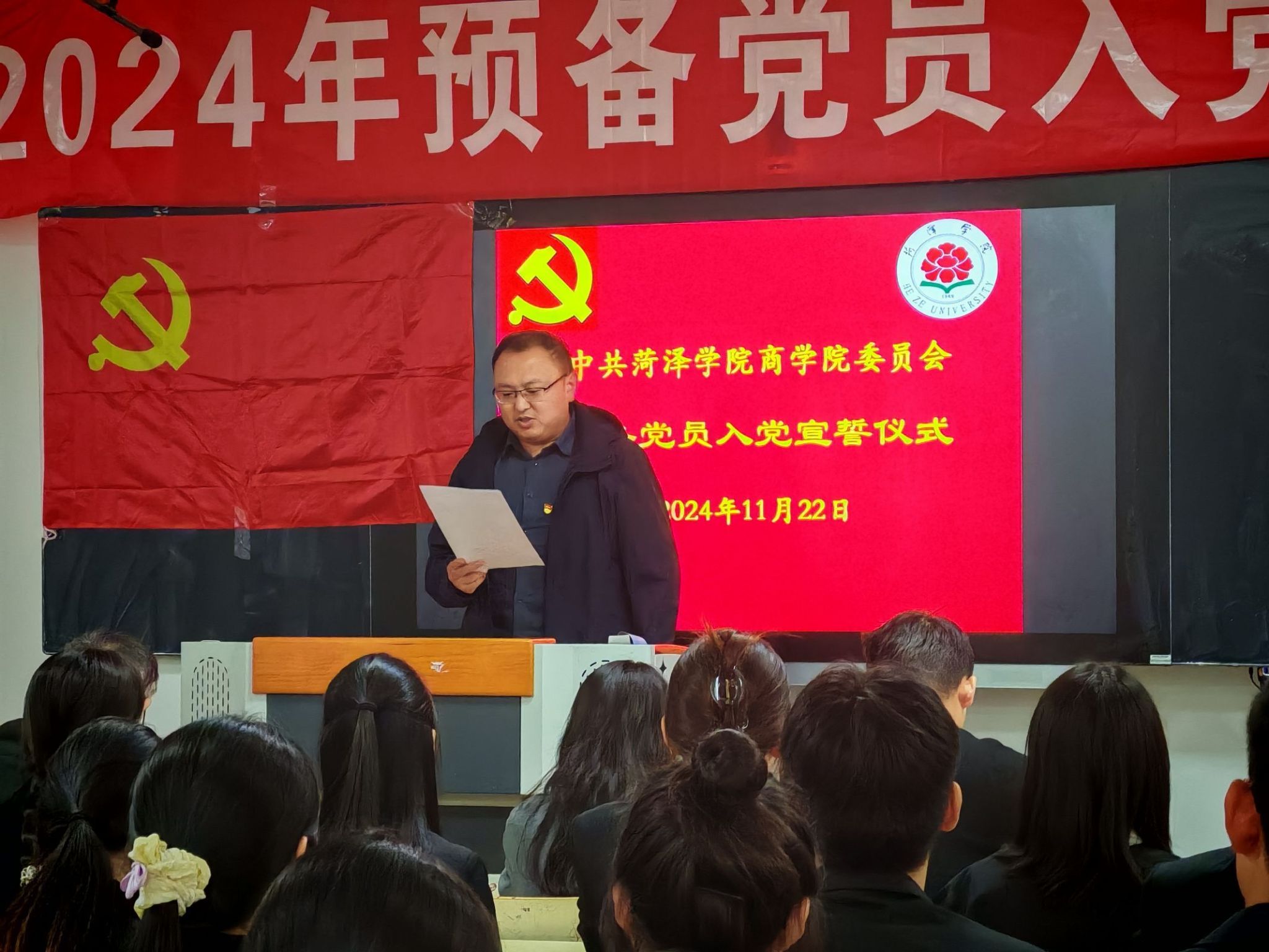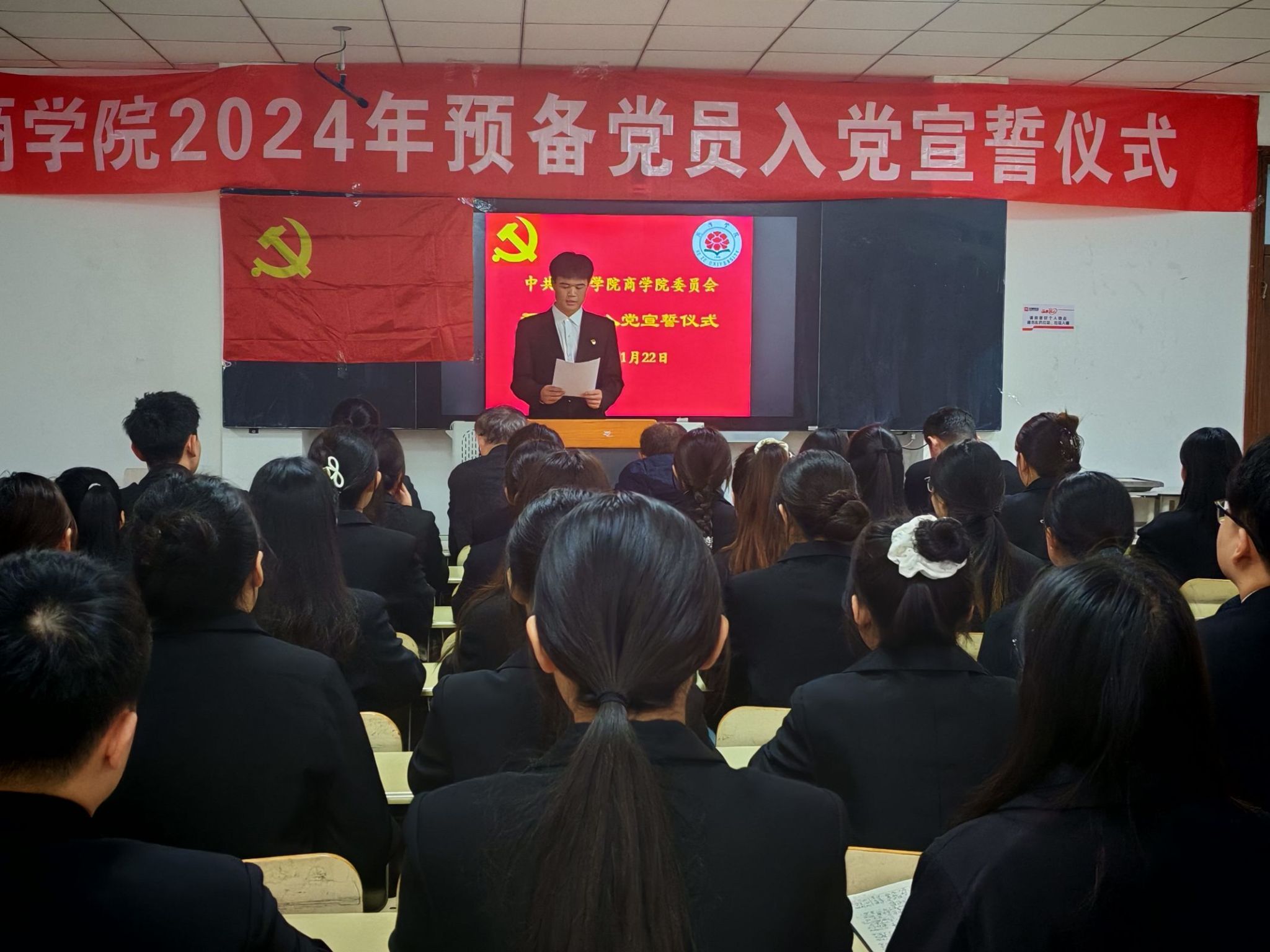 22级金融工程专业皮德贺作为预备党员代表上台发言,阐述了自己内心的澎湃与荣誉之感。其郑重承诺,今后将严格按照党员的标准来要求自我,致力于勤奋学习与工作,以期在实践的过程中不断砥砺党性,全身心地奉献于人民,立志在新时代的大背景下,彰显新的担当与作为。